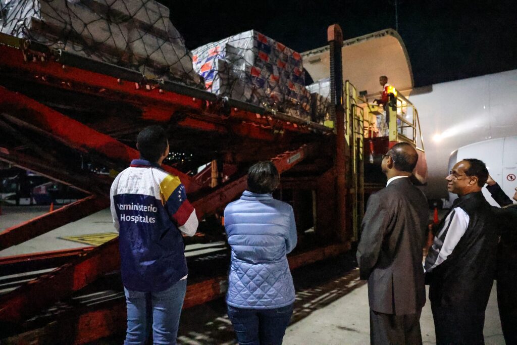 La información la dio a conocer la vicepresidenta Sectorial de Ciencia, Tecnología, Ecosocialismo y Salud, Gabriela Jiménez Ramírez, encargada de recibir el cargamento, junto al Excelentísimo Embajador de la India en Venezuela, Sr. PK Ashok Babu, y el viceministro de Hospitales del Ministerio del Poder Popular para la Salud, Jesús Osteicoechea, en el Aeropuerto Internacional de Maiquetía.